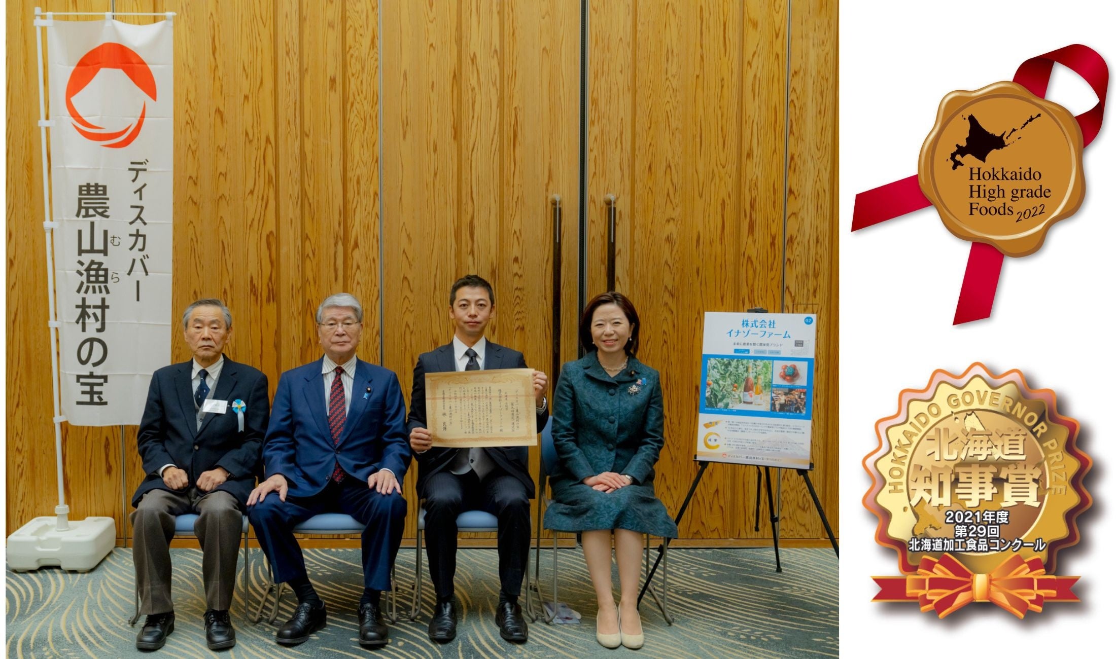 2022年11月、農林水産省及び内閣官房により、農山漁村活性化の優良事例である「ディスカバー農山漁村(むら)の宝」第9回で選定された全国37地区のひとつとして当ファームがビジネス・イノベーション部門にて選出されました。『有機トマトジュース クリア』は北のハイグレード食品2022に選定、第29回北海道加工食品コンクールで北海道知事賞を受賞。今回の令和4年度優良ふるさと食品中央コンクール新製品開発部門の農林水産大臣賞受賞は3冠目となります。