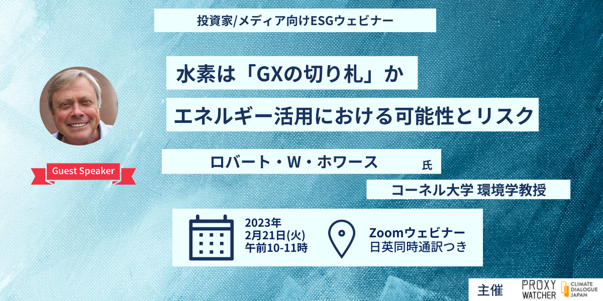 水素は、その製造方法によっていくつかの種類に分けられます。製造過程でCO2を排出せず、再生可能エネルギーで製造されたものを「グリーン水素」と呼びます。しかし、現在、世界の水素の96%は化石燃料によって製造されています。天然ガスを原料とするものを「グレー水素」、石炭を原料とするものを「ブラウン水素」と呼んでいます。天然ガスから製造された水素にCO2回収プロセスを追加したものは「ブルー水素」と呼ばれ、低排出であることが謳われています。 ブルー水素は、グリーン水素よりも経済性が高いという観点から、エネルギー転換におけるソリューションとして期待されています。実際、日本はこれらの関連技術に多額の投資を行っています。また、排出量を減らすために、製造過程で排出される炭素を回収・貯蔵・再利用する「CCS」と「CCUS」の技術を組み合わせる研究が進んでいます。 しかし、市場関係者や科学者からは、ブルー水素技術に関する気候変動リスクや財政リスクを懸念する声が上がっています。 今回ゲスト講師としてお話頂くロバート・ホワース氏はコーネル大学で教鞭をとる傍ら、ニューヨーク州気候行動協議会の委員として、同州の上院の財務、エネルギー・通信、環境保全の常任委員会でエネルギー政策に関する議論をリードしています。ホワース教授らの先駆的研究により、ブルー水素の温室効果ガス排出量は、天然ガスや石炭を燃やすよりも20%、軽油を燃やすよりも60%多いことが分かっています。