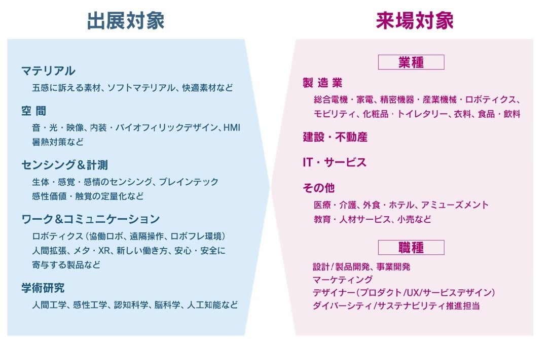 出展対象ではマテリアルや空間デザイン、センシング技術、また快適で安心・安全な働く現場を実現する技術・サービスを広く募集します。来場対象は主に製造業や建設・不動産、IT・サービス業界とし、職種は設計・製品開発、マーケティングやデザイナーが該当します。顧客体験や仕組みをデザインするサービスデザイナーまで広く巻き込みながら、ウェルビーイング社会の実現に向けた最新技術やソリューションを発信します。