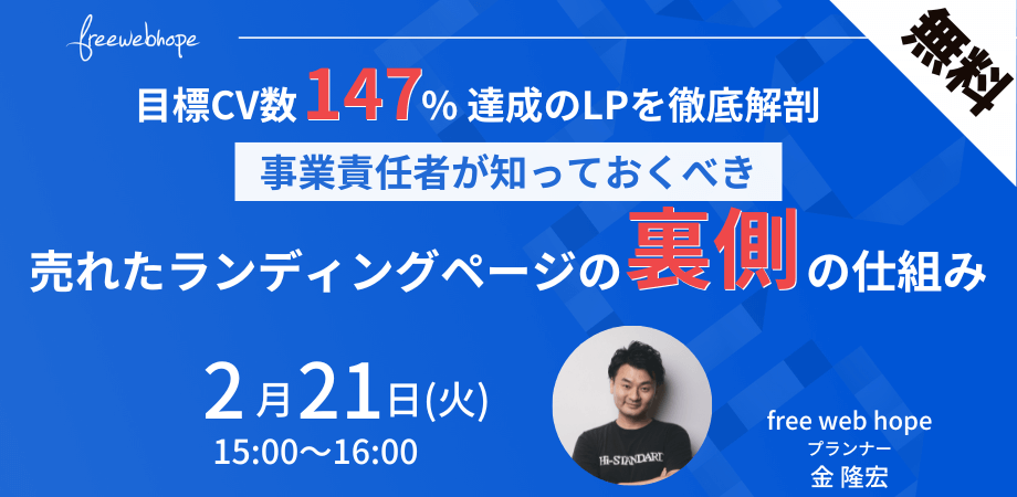 株式会社free web hope(本社:東京都千代田区、代表取締役:相原ゆうき)は、無料のオンラインセミナー「目標CV数147%達成のLPを徹底解剖!事業責任者が知っておくべき売れたランディングページの裏側の仕組み」を2月21日(火)に開催いたします。(お申込みフォーム:https://share.hsforms.com/1x_V0vBUASpuG0esqdcjljw5fwo5)