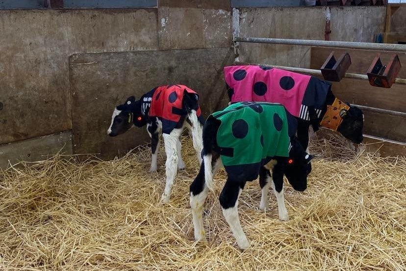 当社では、2019年より、作業着を納品している畜産農家からの要望を受け、仔牛用の防寒グッズを独自に開発・販売するプロジェクト「USIMO」を立ち上げています。これまで、電熱線入りネックウォーマー、マフラー、点滴保温器、防寒コートを相次いで開発。また毎シーズン改良を重ねるなど、創意工夫を繰り返しています。