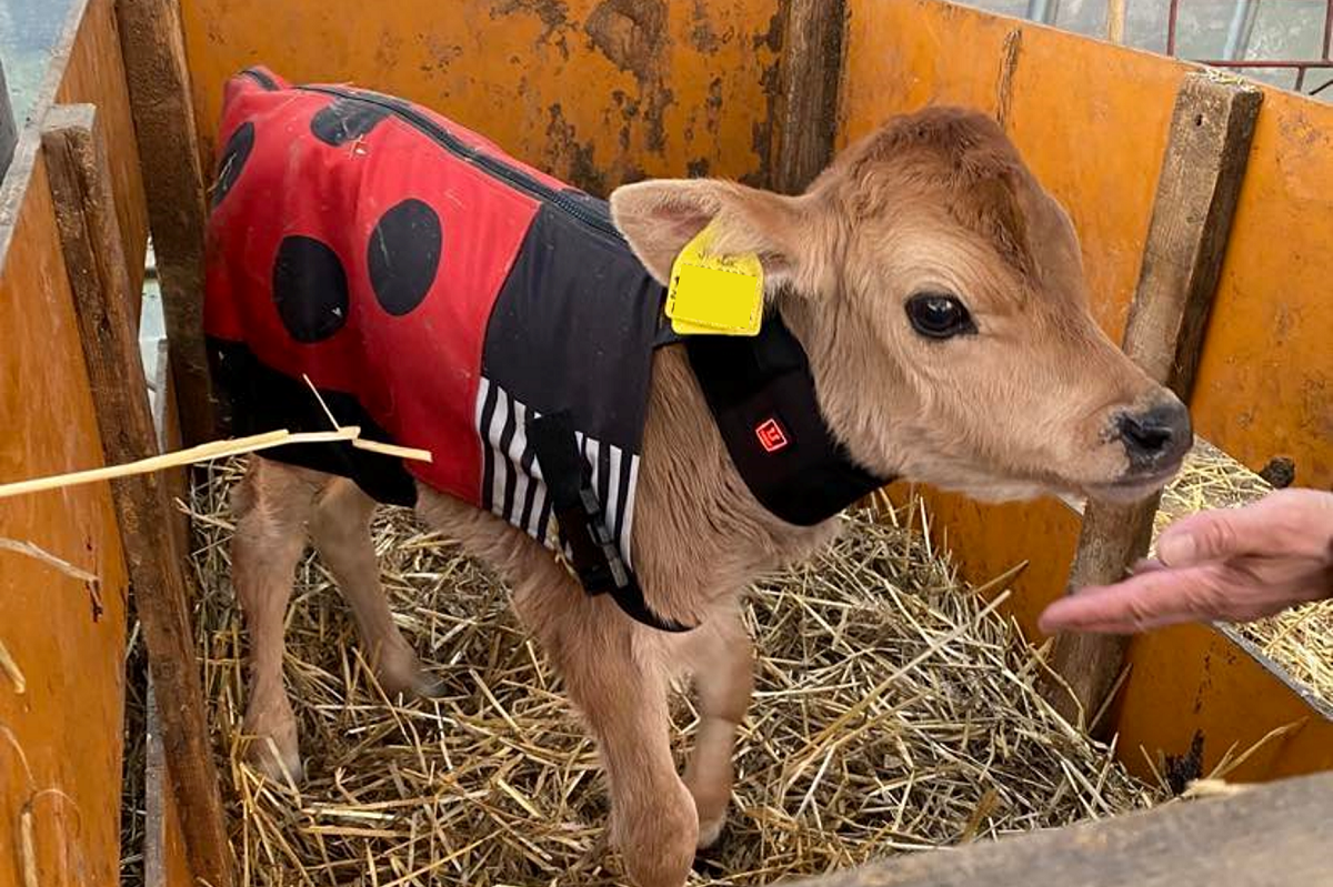 当社では、2019年より、作業着を納品している畜産農家からの要望を受け、仔牛用の防寒グッズを独自に開発・販売するプロジェクト「USIMO」を立ち上げています。これまで、電熱線入りネックウォーマー、マフラー、点滴保温器、防寒コートを相次いで開発。また毎シーズン改良を重ねるなど、創意工夫を繰り返しています。