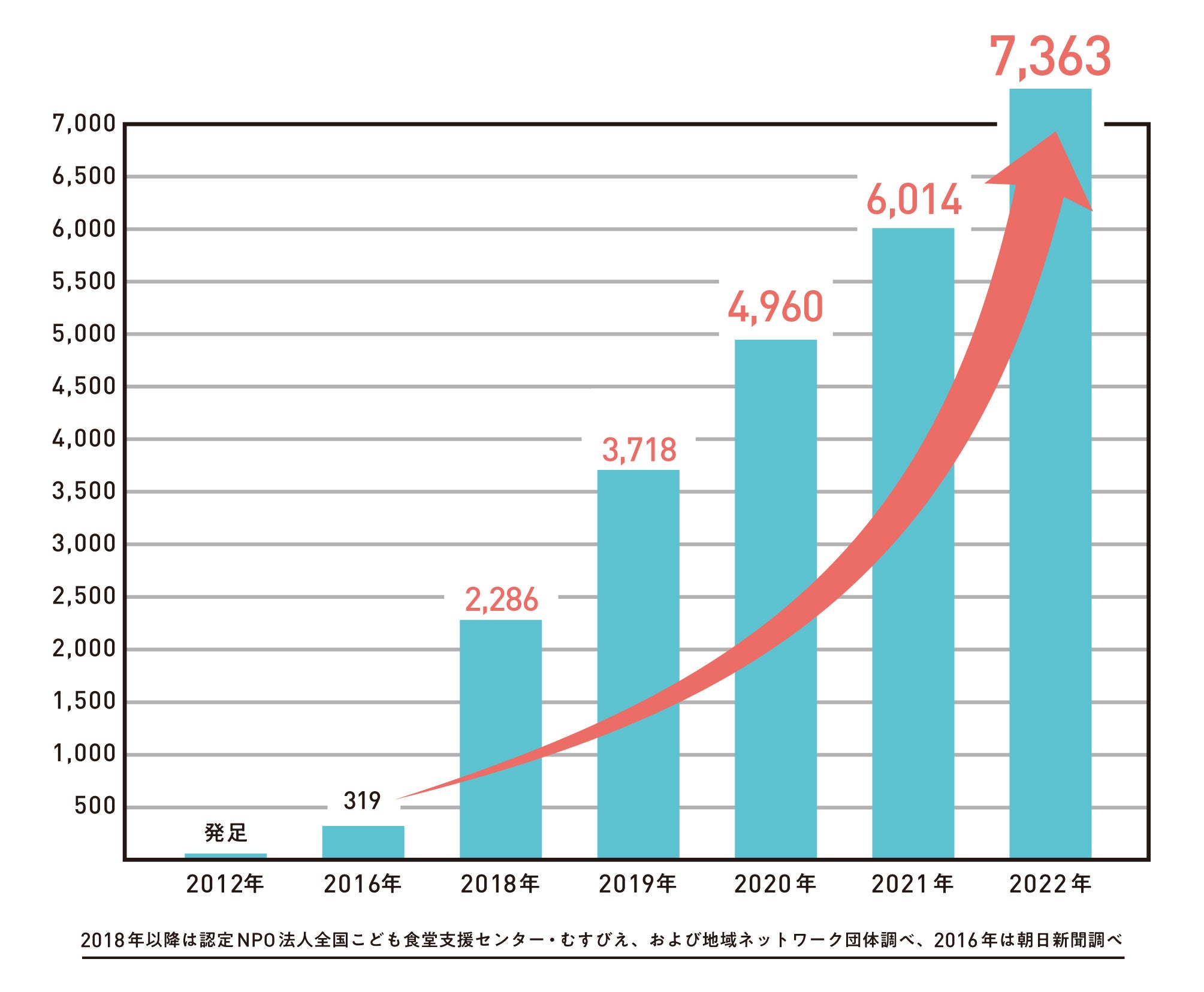 地域食堂、みんなの家などという名称にかかわらず、子どもが一人でも安心して来られる無料または低額の食堂。「子どもの貧困対策」と「地域交流拠点」の2つの大きな軸があり、制度の裏付けはありませんが、箇所数は7,363(むすびえ、地域ネットワーク団体調べ。2023年2月発表)確認されています。(参考:全国の小学校は約2万校、中学校は約1万校、児童館は約4,000カ所。)