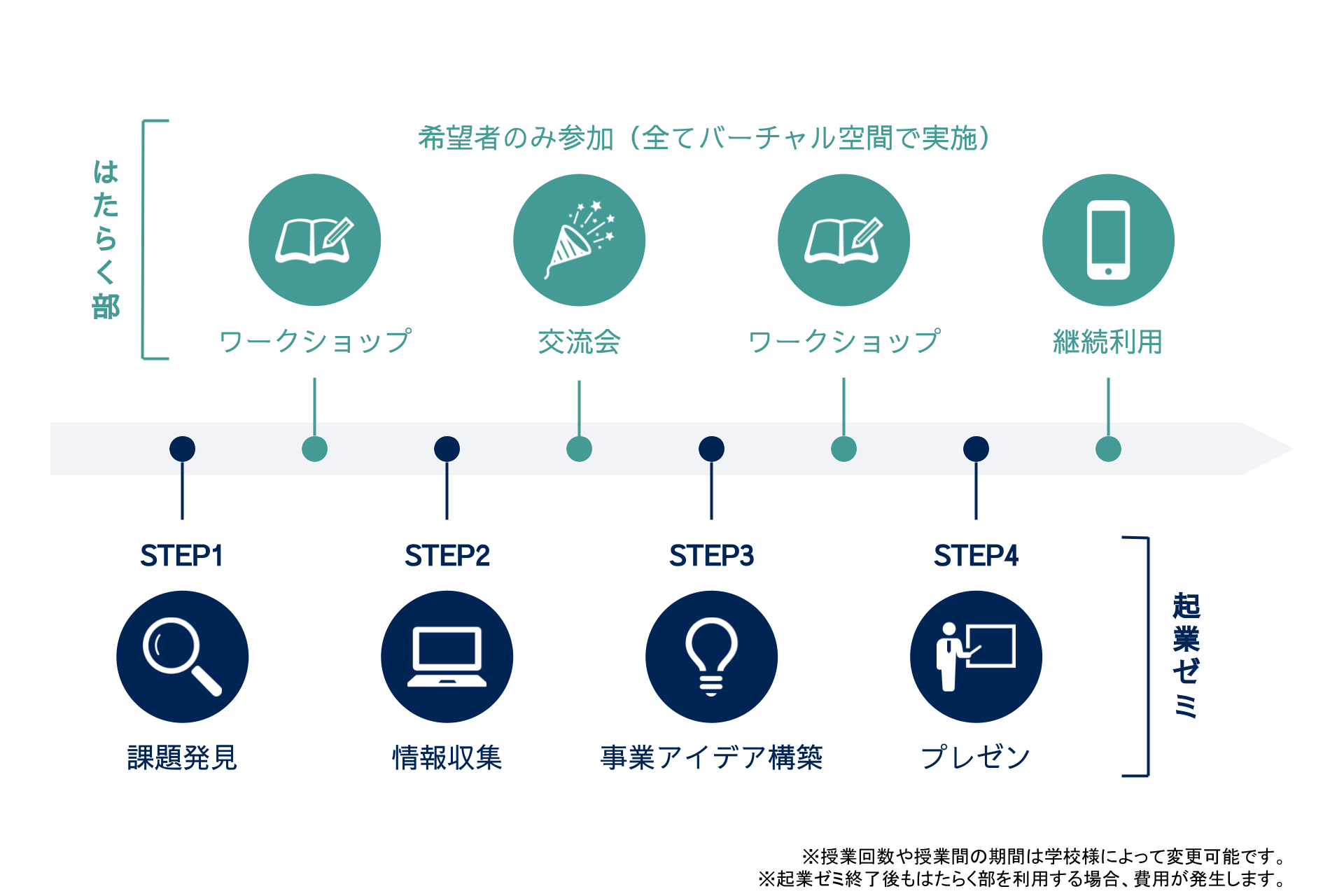 通常の起業ゼミの活動に加え、生徒たちに探究学習プログラムを提供します。「事業創出」「マーケティング」「営業」「デザイン」など社会で求められるテーマをはたらく部コーチと楽しく学べるワークショップ勉強会、他校の生徒たちとの交流会に参加できます。(いずれもバーチャル空間におけるオンライン実施)