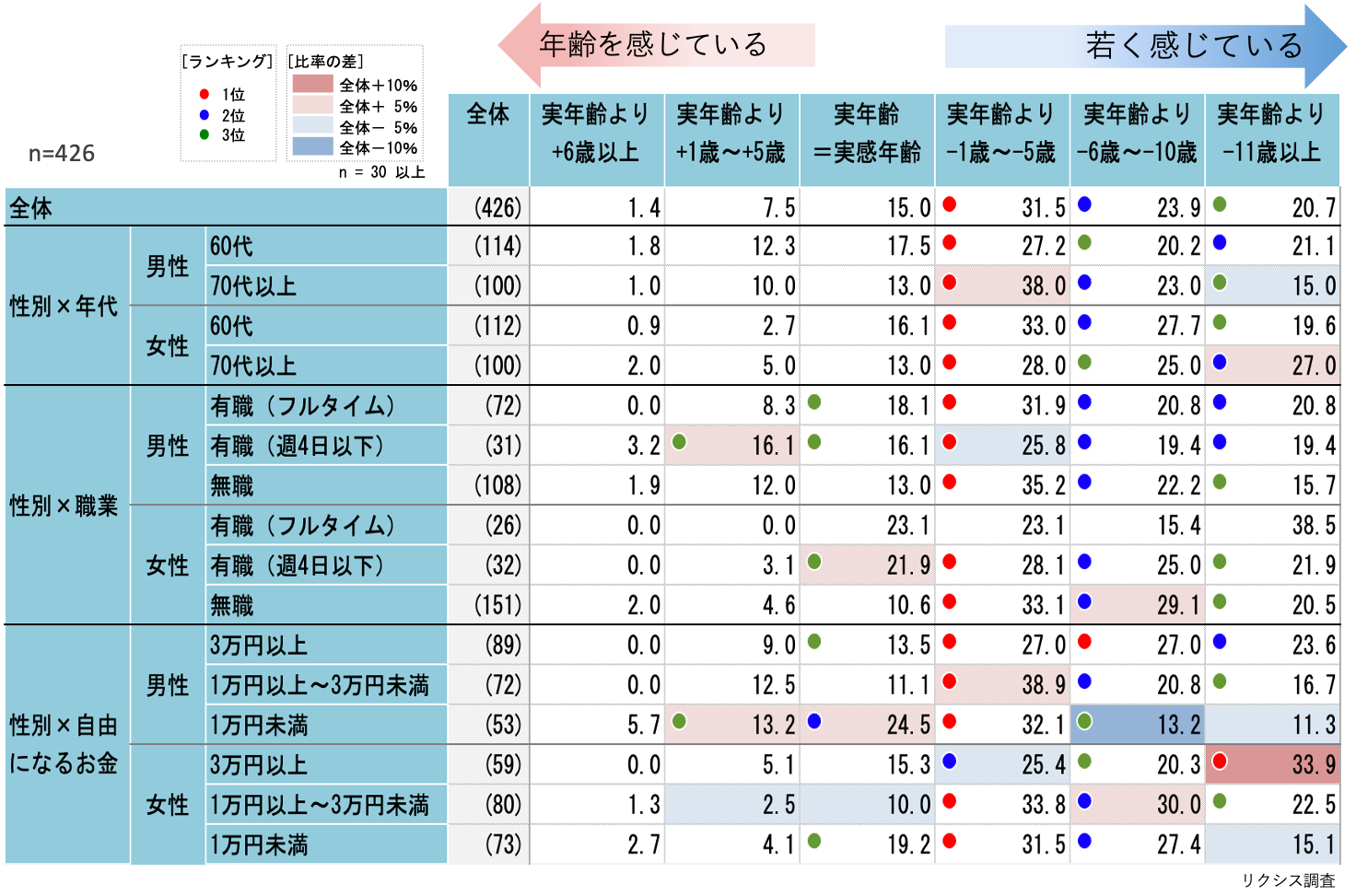 一方で、実年齢よりも年齢を高く感じている人は、「週4日以下の有職者」や「自由になるお金が月1万円未満」の人で特に男性に多くみられる結果となりました。属性による分析などシニアをより細かい軸で捉えていくことの必要性が伺えます。