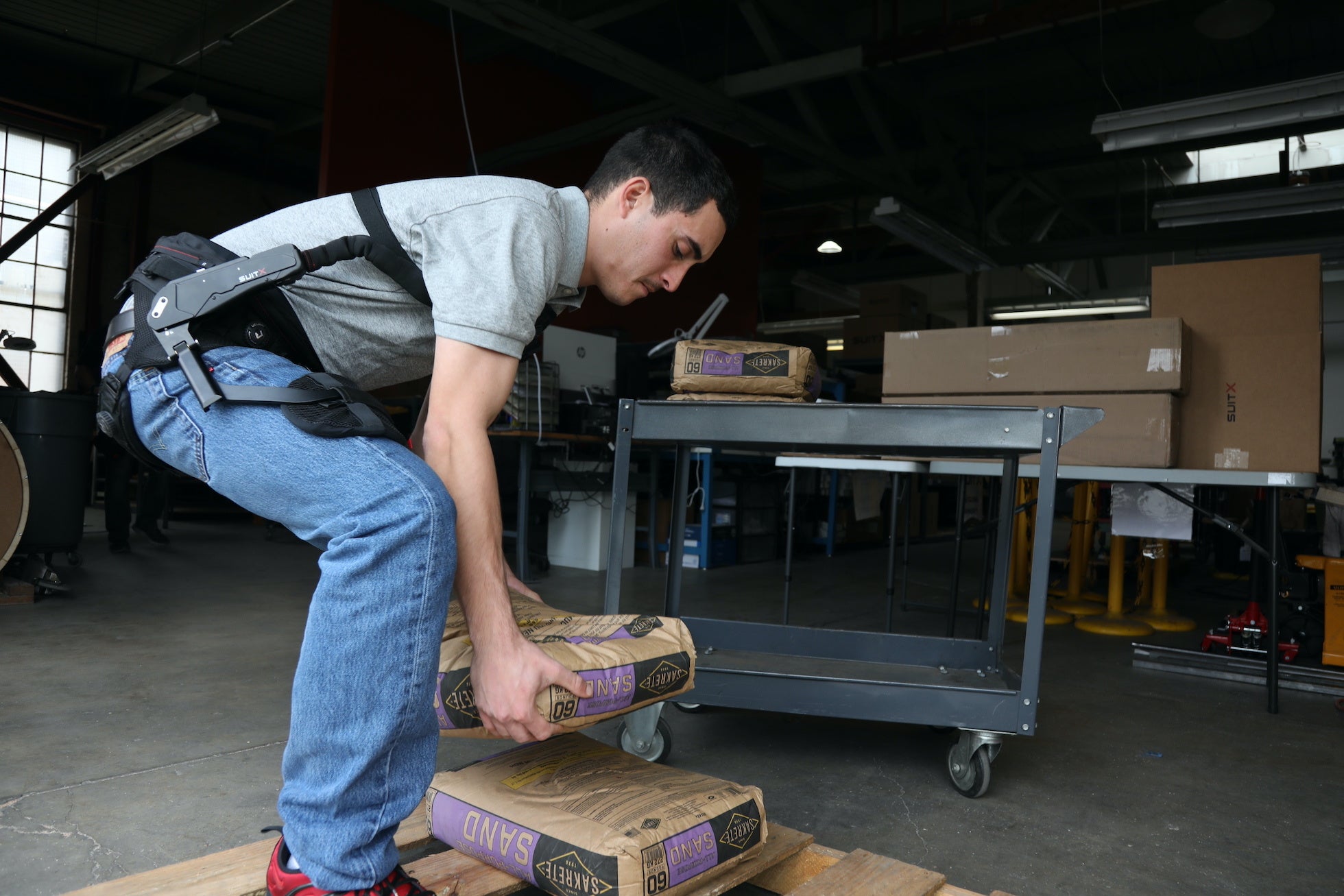 前かがみ姿勢や、物の持ち上げる、腰曲げる、手を伸ばすといった作業中に、腰部(L5/S1椎間板)にかかる力やトルクを平均60%減少させる外骨格型アシストスーツです。