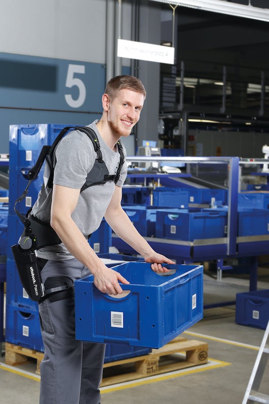 Paexo Back は、物流の専門家と倉庫や小包配送センターの従業員の協力のもと開発されました。この外骨格アシストスーツは、生体力学の原理に従って動作します。バックパックのように荷重を肩で受け止め、外骨格アシストスーツの構造の助けによって大腿部に伝達されます。
