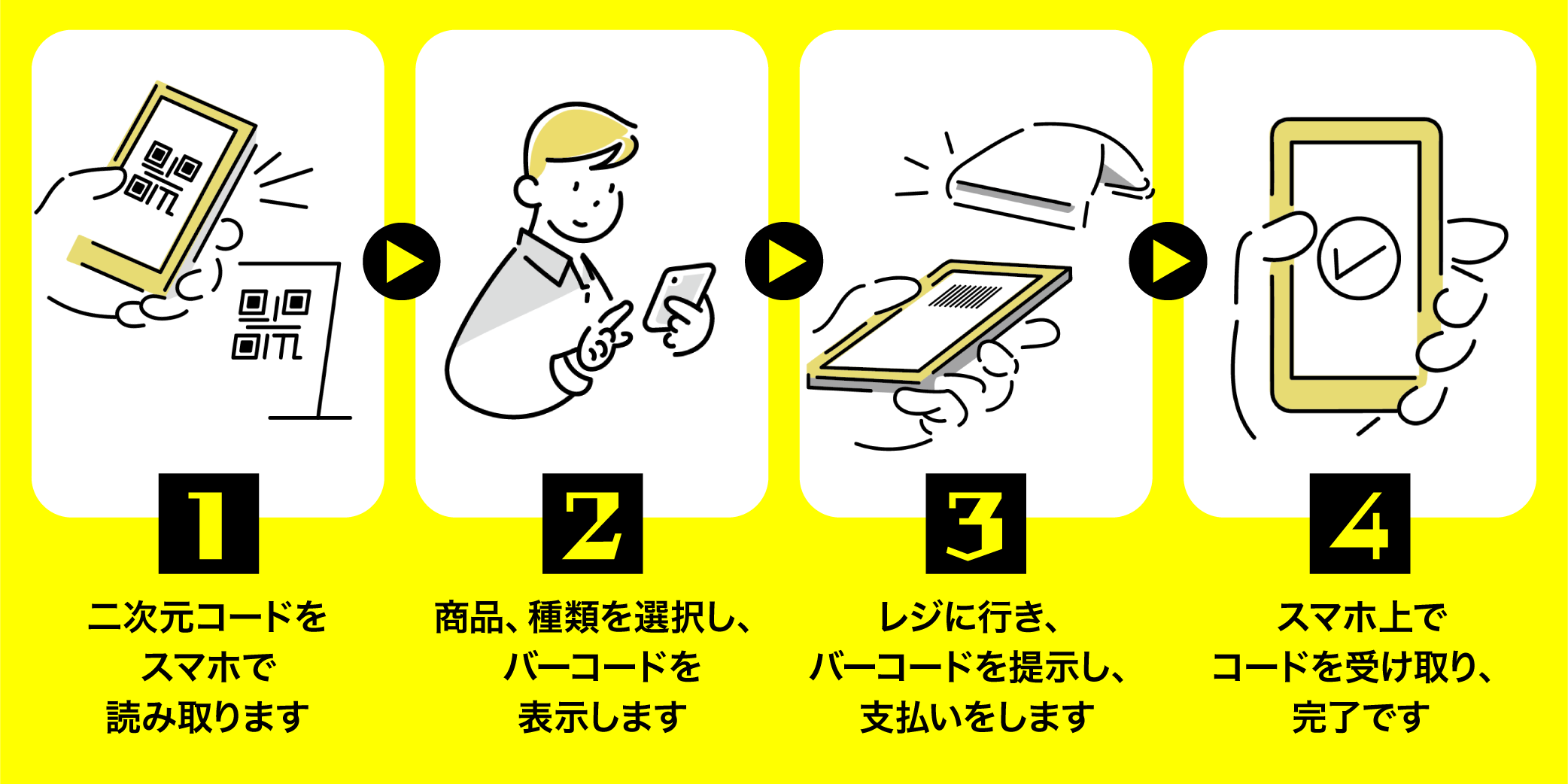 ローソン店内ギフトカードコーナーのPOPにプリントされている二次元コードをスマホで読み取り、スマホ画面に表示されたバーコードをレジで提示してお支払いいただくことで、ネットでのお支払いなどに使えるギフトカードのコード番号を簡単に購入することができるサービスです。