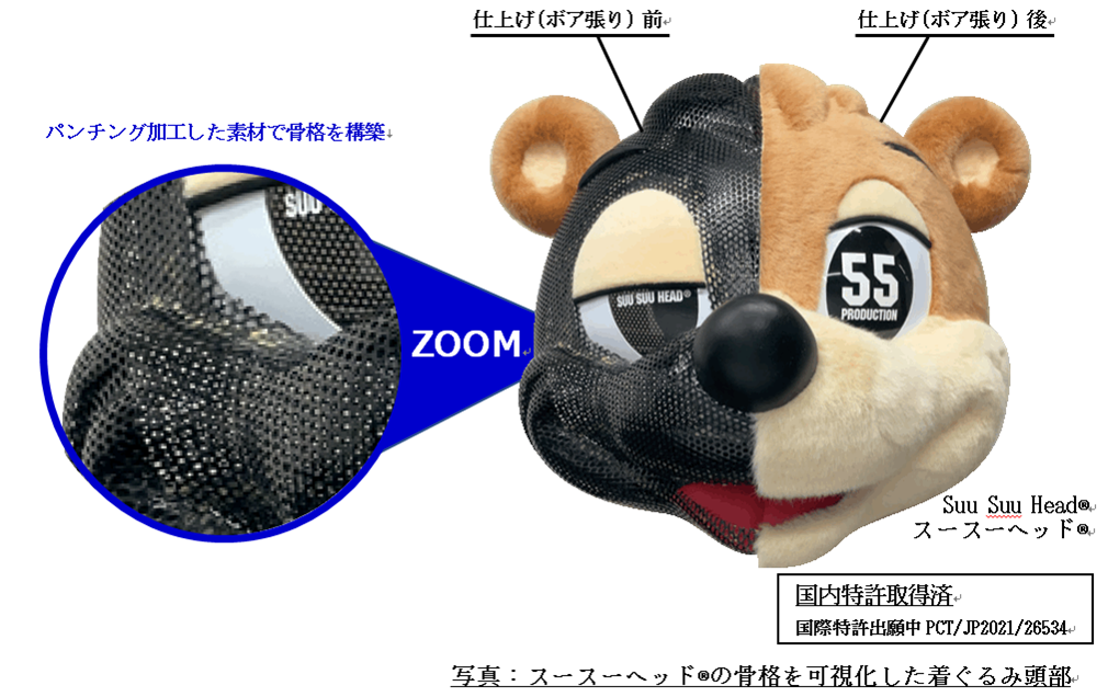 そこで、ゴーゴープロダクションでは、設立当初から掲げる製作理念と蓄積された高い製作技術を駆使して、アクターの安全とエンターテインメントの両立を実現する「スースーヘッド®」を開発しました。本製品は、ABSシートをパンチング加工した素材で着ぐるみの骨格を構築しています。そのことにより、透湿性(湿度↓)・放熱性(温度↓)・換気性(二酸化炭素濃度↓)を有することで熱中症対策となり、軽量性(FRP製の従来品→40%減)や通音性が向上することで操演やコミュニケーション能力のUPにも繋がる世界初の技術です。