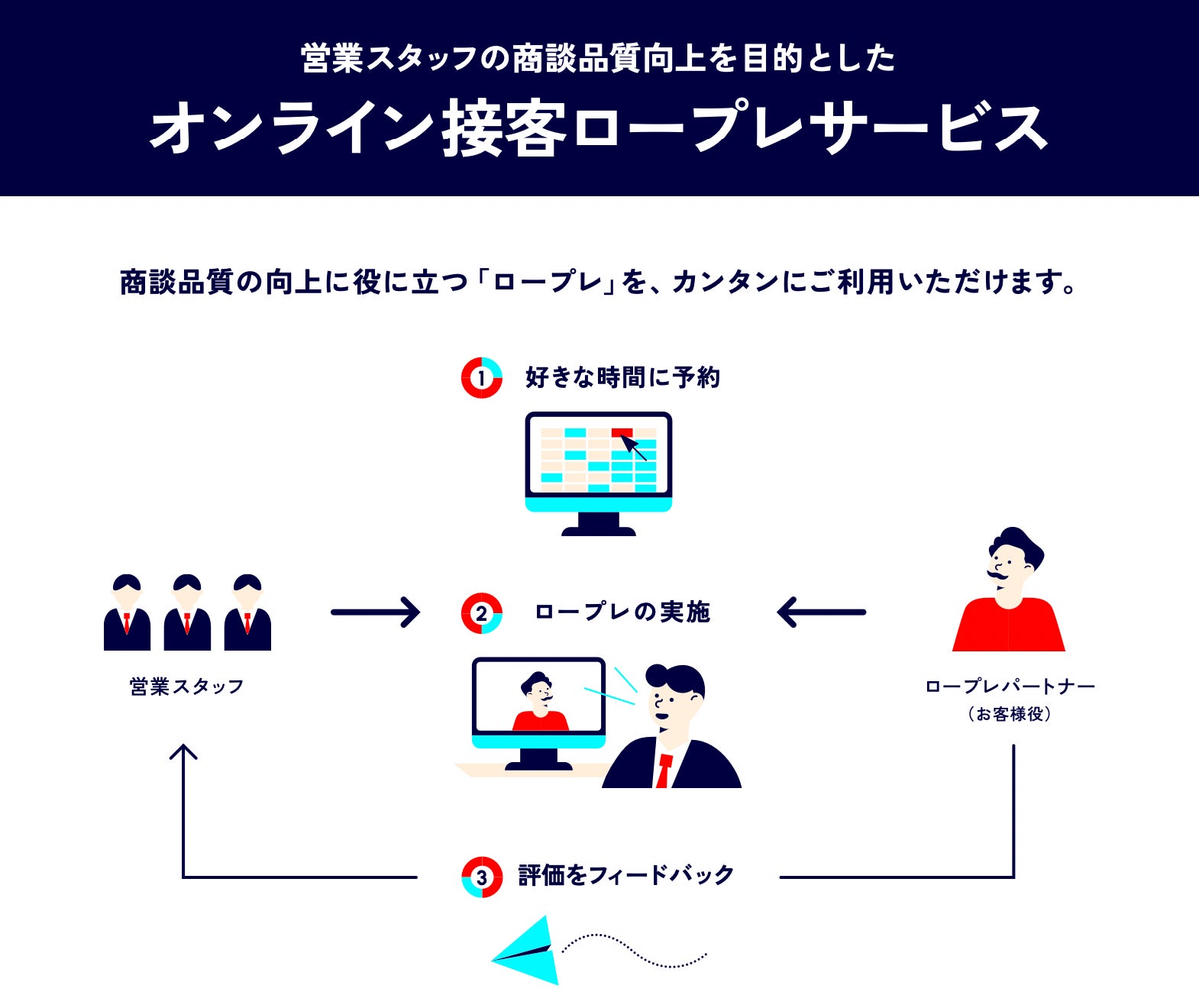 このような課題を解決するために、より効果的かつ効率的に営業スタッフの商談品質向上に働きかける「オンライン接客ロープレサービス」を開発しました。