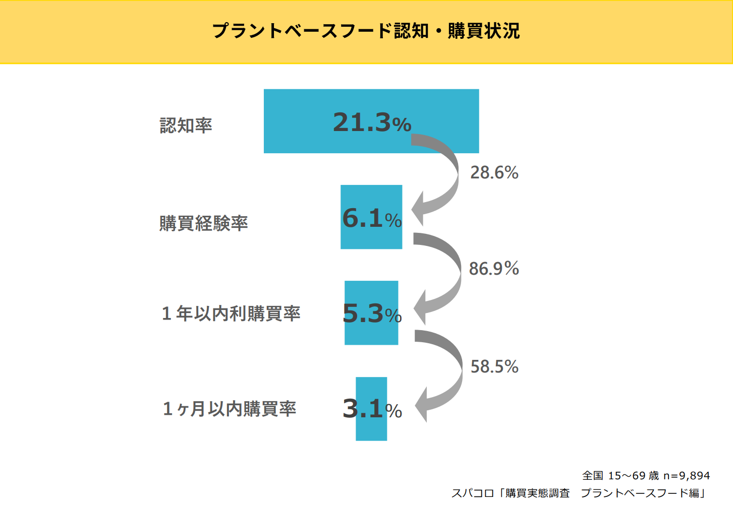 全国の15~69歳の9,894人を対象にプラントベースフードの認知・購買状況を聞いたところ、認知率21.3%、購買経験率6.1%、1年以内購買率5.3%、1ヶ月以内購買率3.1%。