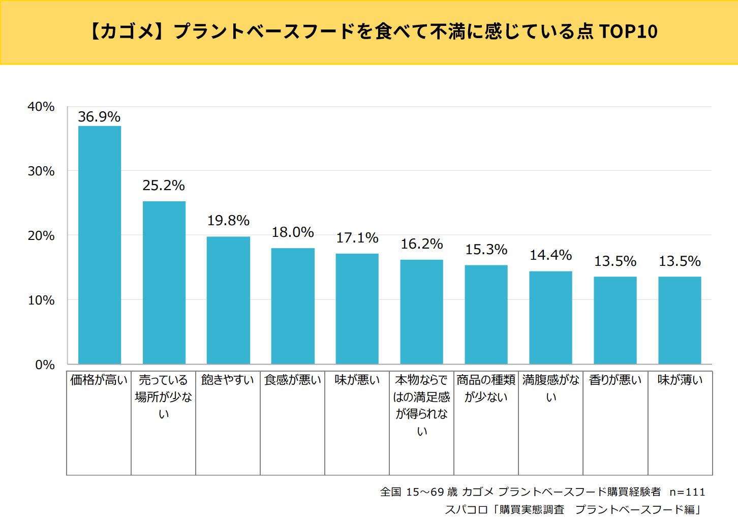 カゴメのプラントベースフード購買経験者にきいたプラントベースフードを食べて不満に感じている点は上位から「価格が高い」(36.9%)、「売っている場所が少ない」(25.2%)、「飽きやすい」(19.8%)、「食感が悪い」(18.0%)が続く結果となりました。