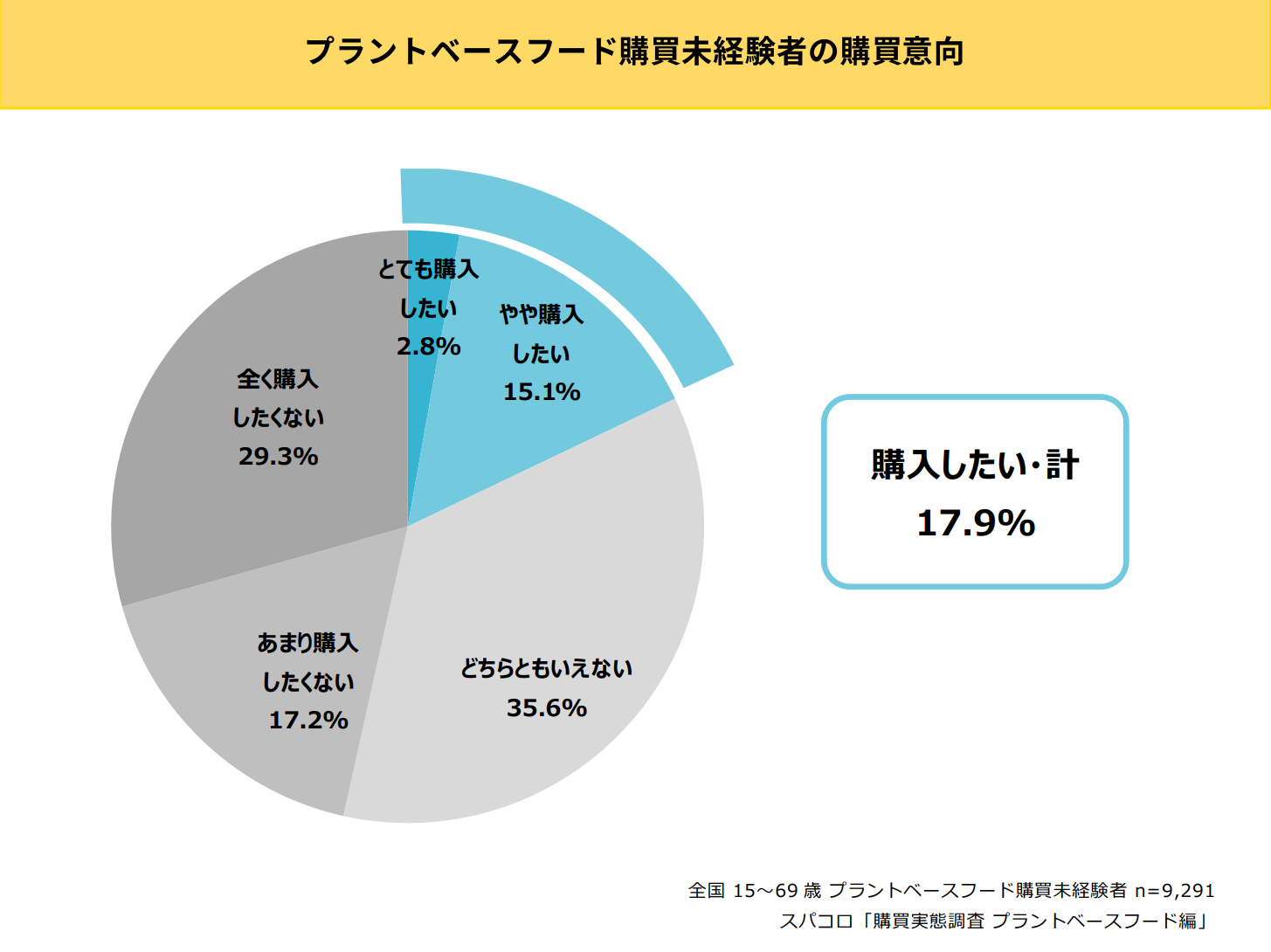プラントベースフード購買未経験者に聞いたプラントベースフードの購買意向では「とても購入したい」(2.8%)、「やや購入したい」(15.1%) 、「どちらともいえない」(35.6%)、「あまり購入したくない」(17.2%) 、「全く購入したくない」(29.3%)。