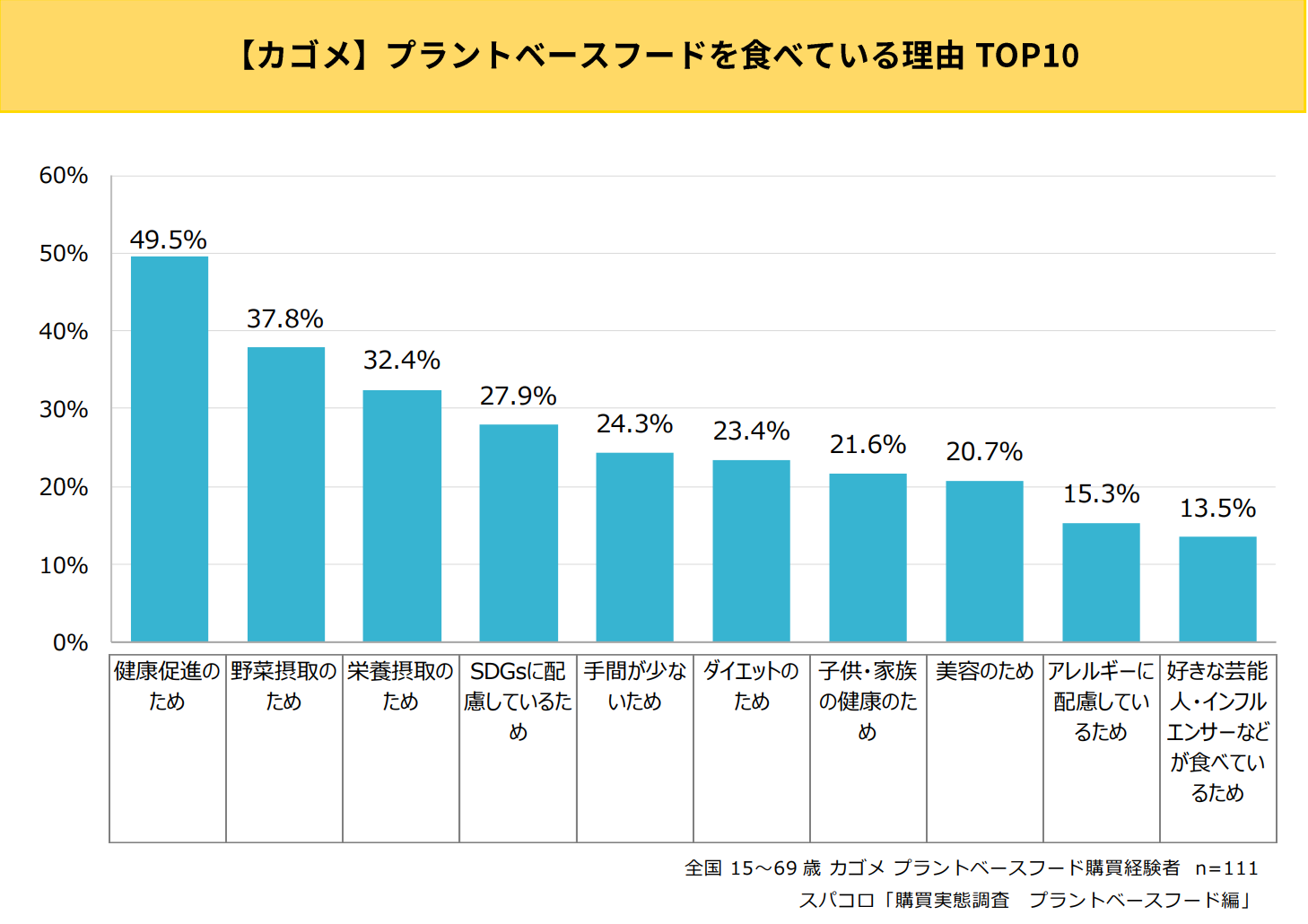 カゴメの購買経験者にプラントベースフードを食べている理由は上位から「健康促進のため」(49.5%)、「野菜摂取のため」(37.8%)、「栄養摂取のため」(32.4%) 、「SDGsに配慮しているため」(27.9%)が続く結果に。