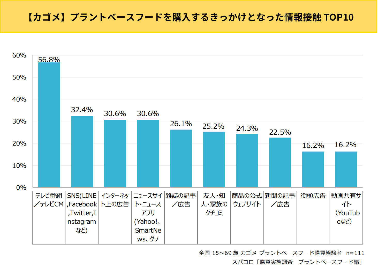 実際、購買者はどんな情報をきっかけとしてカゴメのプラントベースフードを購入したのでしょうか。カゴメのプラントベースフード購買経験者にきいた購入のきっかけとなった情報は上位から「テレビ番組/テレビCM」(56.8%)、「SNS」(32.4%)、「インターネット上の広告」(30.6%)、「ニュースサイト・アプリ」(30.6%)が続いています。