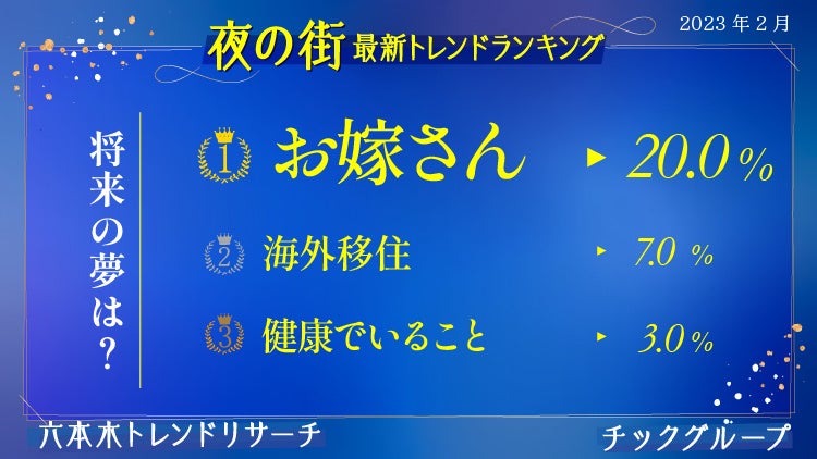 2023年に入りキャスト達の夢を調査。1位はなんと「お嫁さん」 (20.0%)という結果に。「専業主婦にあこがれる」という声が多いようです。2位以下は比較的意見が分かれる結果でしたが、「海外移住」 (7.0%) 、「健康でいること」 (3.0%)という安定志向の意見が多く見られました。回答の中には「ロールスロイスを正規ディーラーから買うこと」といったハイレベルな夢を持つキャストも。