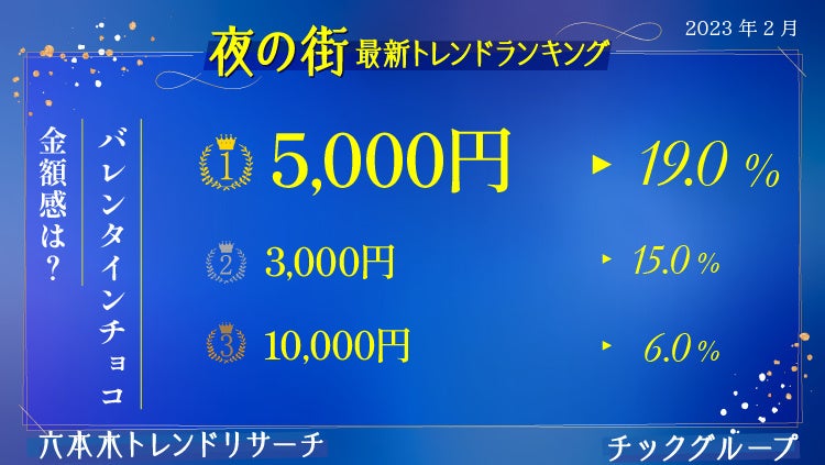 最後に六本木のバレンタイン事情も調査しました。1位は「5,000円」(19.0%)ではあるものの、3位「10,000円」(6.0%)と、相場の金額感としてはやはり少々高めの印象。尚、チョコを贈る予定の人は「お客さん」が30%という結果でした。