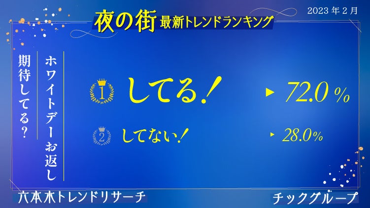最後にホワイトデーに関しては72.0%がお返しを求めているという結果でしたので、六本木でチョコレートをもらった方はぜひ意識したほうがいいようです。