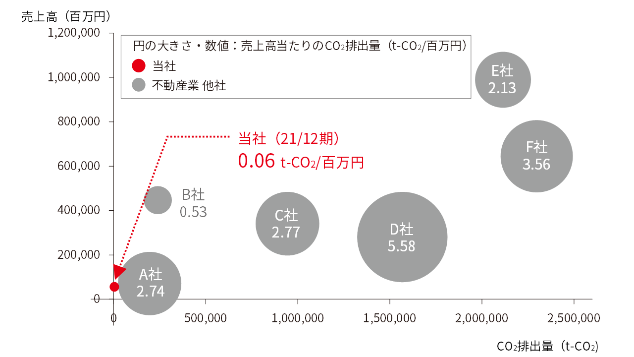 今般、2021年12月期のCO2排出量(Scope1・2・3)の算定(※1)を行い、当社のCO2排出量、並びに、当社の売上高当たりのCO2排出量が、不動産業界で極めて低い水準であることを確認いたしました。このことは、土地のみに投資を行うJINUSHIビジネスの環境負荷が低いことの証左と認識しております。あわせて、自社排出分(Scope1・2)のカーボンニュートラルについて、再生可能エネルギーの活用や排出権購入等により、前倒しで達成いたしました。