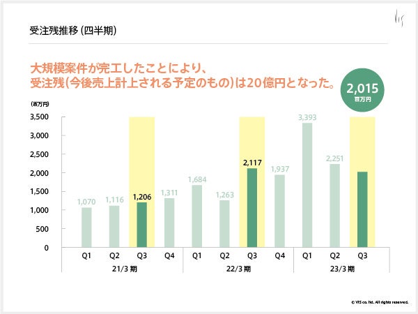 大規模案件が完工したことにより、受注残(今後売上計上される予定のもの)は20億円となりました。