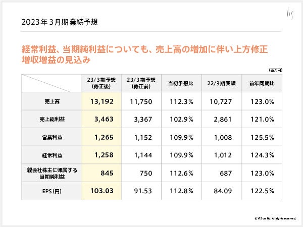 経常利益、当期純利益についても、売上高の増加に伴い上方修正し、増収増益の見込みです。