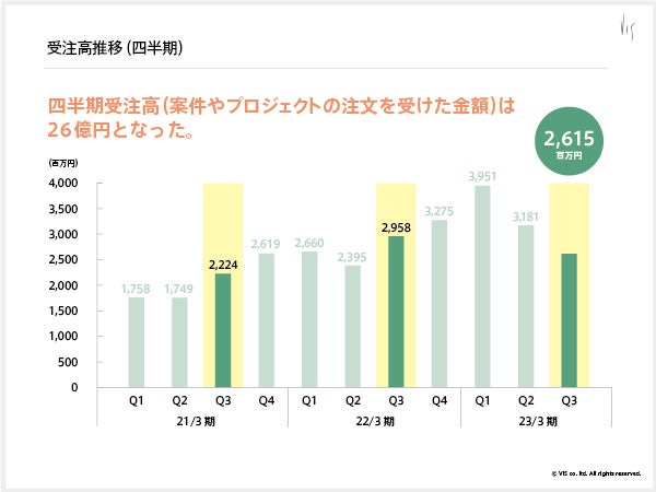 四半期受注高(案件やプロジェクトの注文を受けた金額)は26億円となりました。