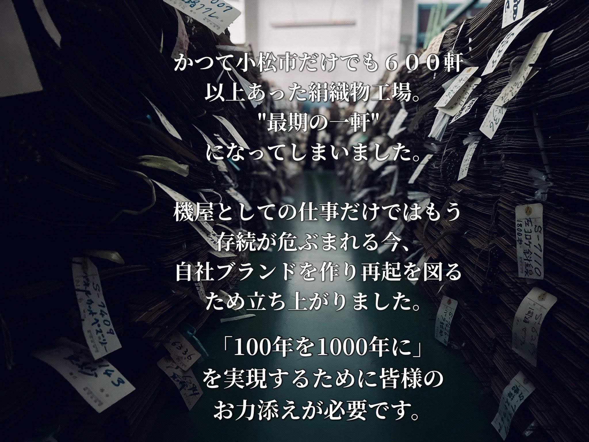 明治30年創業126年目の織物会社。日本最後の広幅洋装絹装絹製織工場。100年の伝統と歴史を持ち、非常に繊細で高度な技術をもち合わせるシルクジャカード織りを中心に織っており、取引先は世界的メゾンも多数承っている。