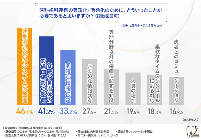医科歯科連携の実現化・活発化には、連携のためのシステム整備が必要だと考える方が多いようです。