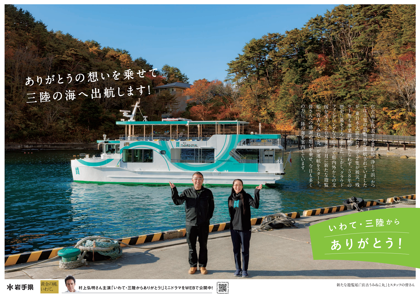 クラウドファンディング等により運航を再スタートした遊覧船の姿を通じ、県内外からの支援への感謝を発信。