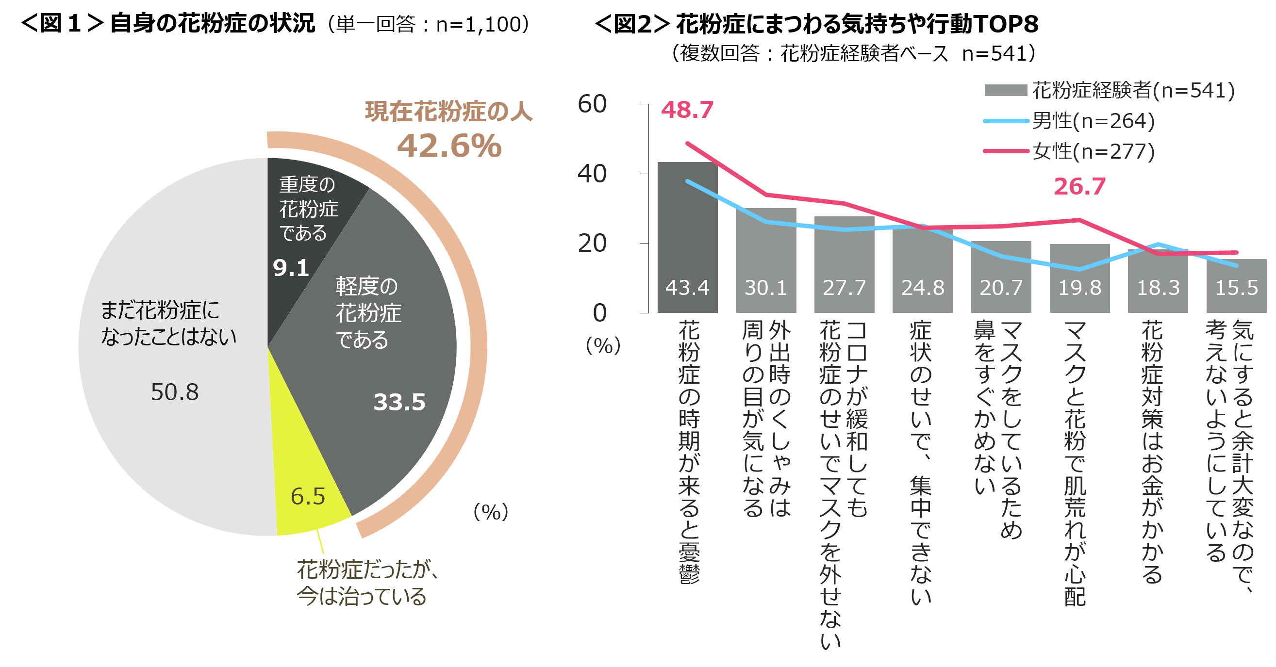 特に、女性は「マスクと花粉で肌荒れが心配」と「花粉症の時期が来ると憂鬱」が男性と比較し高い。