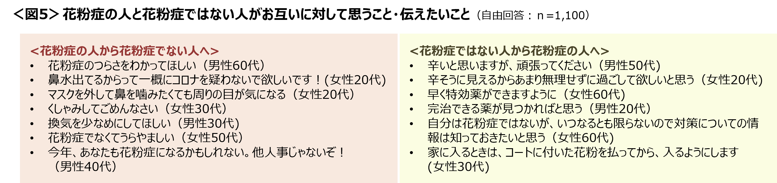 花粉症の人から花粉症ではない人に対して、「辛さをわかってほしい」「コロナを疑わないで欲しい」「花粉症でないのがうらやましい」といった声が多い。<図5>