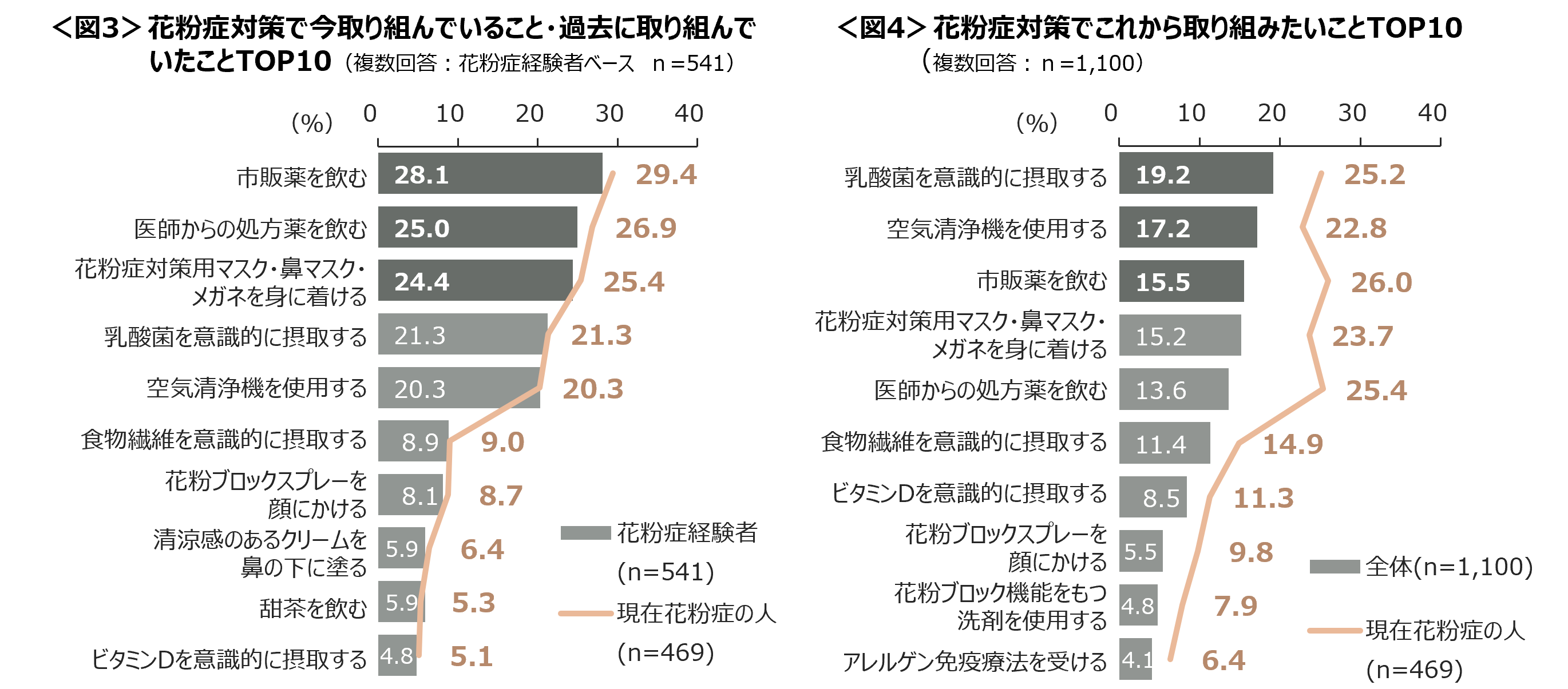 現在取り組んでいる、または過去に取り組んでいた花粉症対策は、「市販薬を飲む」「医師からの処方薬を飲む」「花粉症対策用マスク・鼻マスク・メガネを身に着ける」が上位。<図3>
