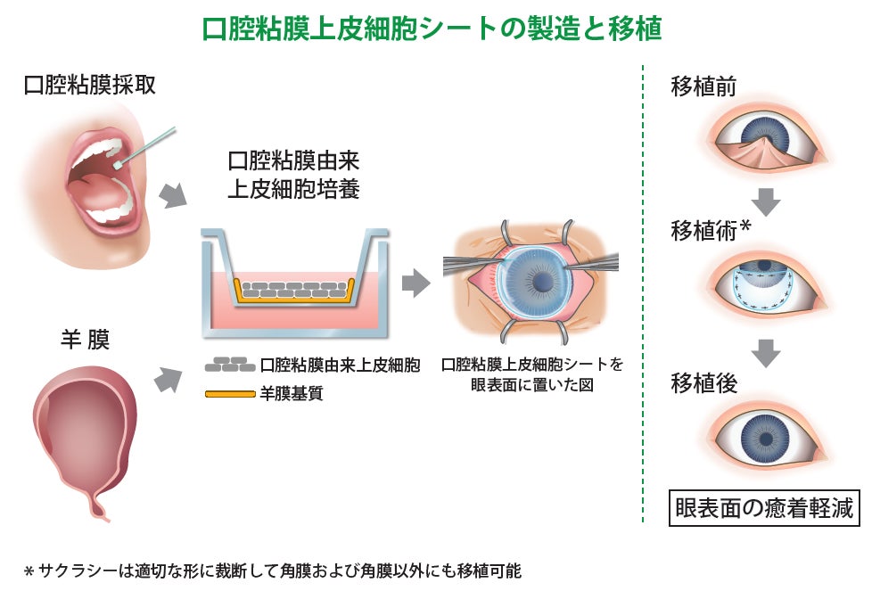 角膜上皮幹細胞疲弊症は、角膜輪部に存在する幹細胞の消失により、正常な角膜上皮の供給が妨げられ、角膜上に結膜組織が進展し、瞼球癒着(眼球とまぶたの癒着)が生じる希少疾病です。従来、このような癒着を伴う眼表面疾患に対しては十分に有効な治療法がありませんでした。「サクラシー®」は、患者自身より採取した口腔粘膜上皮細胞を、ヒト羊膜から作製した羊膜基質上に播種・培養して製した口腔粘膜上皮細胞シートです。患者様の眼表面に移植することにより、羊膜の基底膜が強度を持った支持組織として作用することで、口腔粘膜上皮細胞の生着・上皮化が期待できます。その結果、眼表面の高度のドライアイや角化を伴う重症患者に対しても適応可能で、高度の瞼球癒着に対する癒着軽減に用いることが可能です。