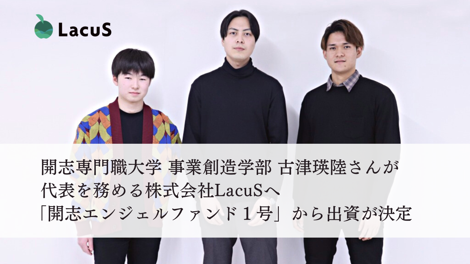 「開志エンジェルファンド1号」は、在学生・卒業生のスタートアップ支援を目的として2021年に設立した、1億円規模の大学ベンチャー投資ファンドです。このたび、LacuSが提案する新規事業計画に対する投資審査が行われ、2023年1月31日、正式に出資が決定しました。