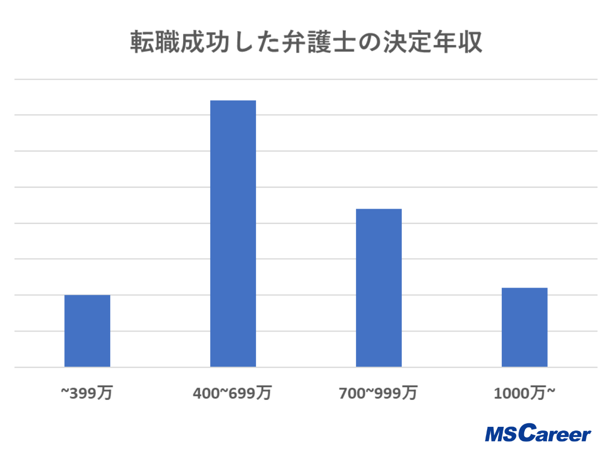 弁護士の転職では、非常勤の雇用形態を除くと、決定年収は平均が765.1万円、中央値が652.9万円で、全国の平均世帯年収552万円より200万円以上高いという結果になりました。