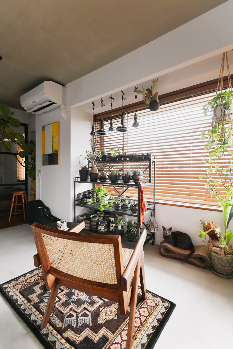 大きな鉢物は置けなくても、ダクトレールや天井・梁につけたライティングレールに植物を吊るして楽しむことができます。