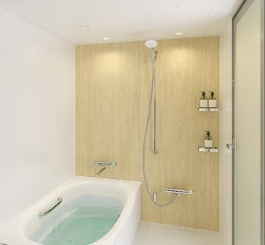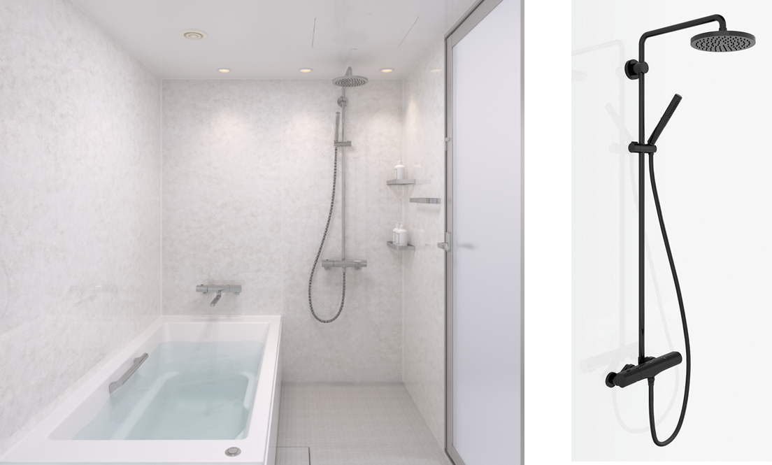 またリラックスにこだわったアイテムも充実させています。3つの吐水モードをもったシャワーでありながら、端正で洗練されたデザインを有する「エコアクアシャワーSPA」を搭載します。肩やひざまわりがゆったりとし、首あたりや浴槽の縁をつかむ時の腕のあたりの良さが特徴の「ミナモ浴槽」も搭載しました。