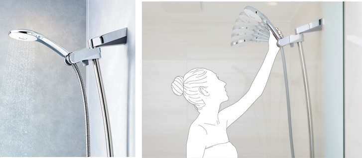 弓型に手前に湾曲している形状のため、立ち姿勢のまま頭上からシャワーを浴びることができます。また高さだけでなくスライドフックが水平に回転し、シャワーの向きを調節できるので快適なシャワーポジションでに設定できます。