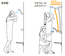 くつろぎながら普段と同様に座ってシャワーを浴びることができるよう、水栓金具の位置を低めに設定しているタイプ。手軽にオーバーヘッドシャワーの心地よさを味わえるフルフォールシャワーやカンタンに壁から外して、とるピカカウンターなども装備が可能。狭小空間においても、快適な入浴を実現できる空間にしました。