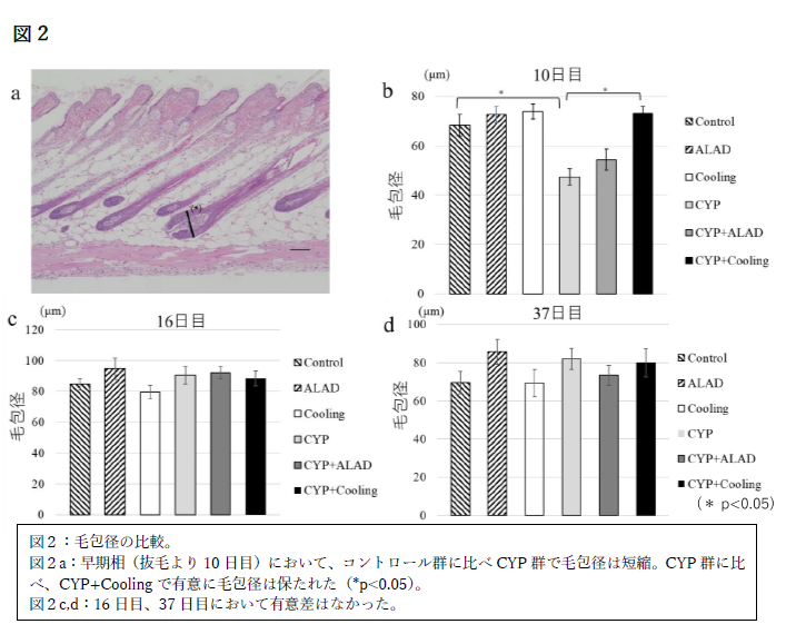 我々はICR(Institute of Cancer Research)マウスを使用して、抗がん剤シクロフォスファミド120 μg/gの抗がん剤脱毛モデル*2を作成した。治療は皮膚冷却*3とαリポ酸誘導体塗布*4を行った。それによる脱毛スコア、毛包径、IGF-1*5値、血管透過性*6、およびアポトーシス*7細胞数を、シクロフォスファミド投与のみの場合とシクロフォスファミド+各治療群とで比較*8した。