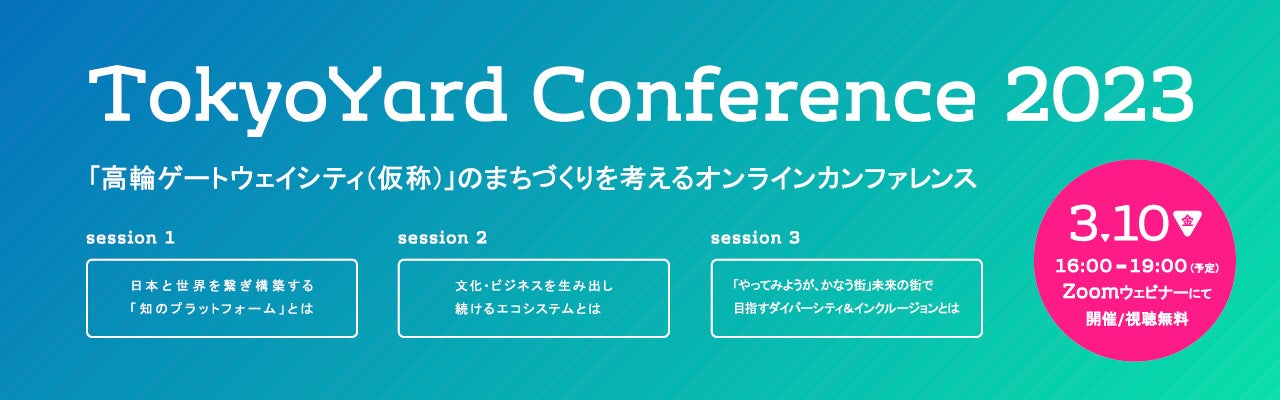 | オンラインカンファレンス「TokyoYard Conference 2023」を開催します。 今回は、「日本と世界を繋ぎ構築する“知のプラットフォーム”」「文化・ビジネスを生み出し続けるエコシステム」「未来の街で目指すダイバーシティ&インクルージョン」という3つの切り口から、多彩なゲストを迎えてクロストークを展開します。 「高輪ゲートウェイシティ(仮称)」のまちづくりでは、地域の皆さまやまちづくりパートナー、ご視聴の皆さまとの共創を通して、「やってみようが、かなう街」の実現を目指しています。ぜひご視聴いただき、まちづくりについて知っていただくとともに、皆さまご自身の「やってみよう」をお聞かせください。 |