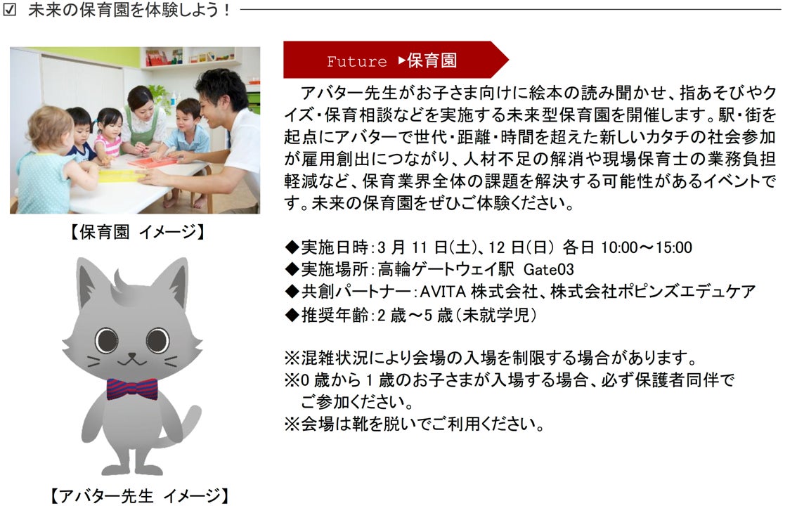 本イベントでは「-Play×Future-」をコンセプトに、ロボットやアバターと共生するエキマチに触れていただくため、街の開業に先行して駅の中や様々なイベントコンテンツにおいて実験的に活用します。