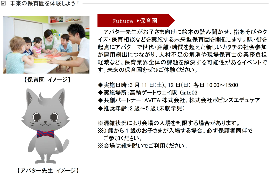本イベントでは「-Play×Future-」をコンセプトに、ロボットやアバターと共生するエキマチに触れていただくため、街の開業に先行して駅の中や様々なイベントコンテンツにおいて実験的に活用します。