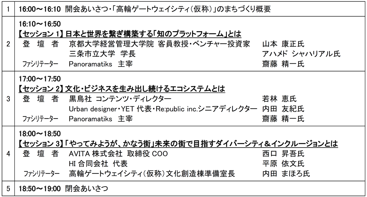 | オンラインカンファレンス「TokyoYard Conference 2023」を開催します。 今回は、「日本と世界を繋ぎ構築する“知のプラットフォーム”」「文化・ビジネスを生み出し続けるエコシステム」「未来の街で目指すダイバーシティ&インクルージョン」という3つの切り口から、多彩なゲストを迎えてクロストークを展開します。 「高輪ゲートウェイシティ(仮称)」のまちづくりでは、地域の皆さまやまちづくりパートナー、ご視聴の皆さまとの共創を通して、「やってみようが、かなう街」の実現を目指しています。ぜひご視聴いただき、まちづくりについて知っていただくとともに、皆さまご自身の「やってみよう」をお聞かせください。 |