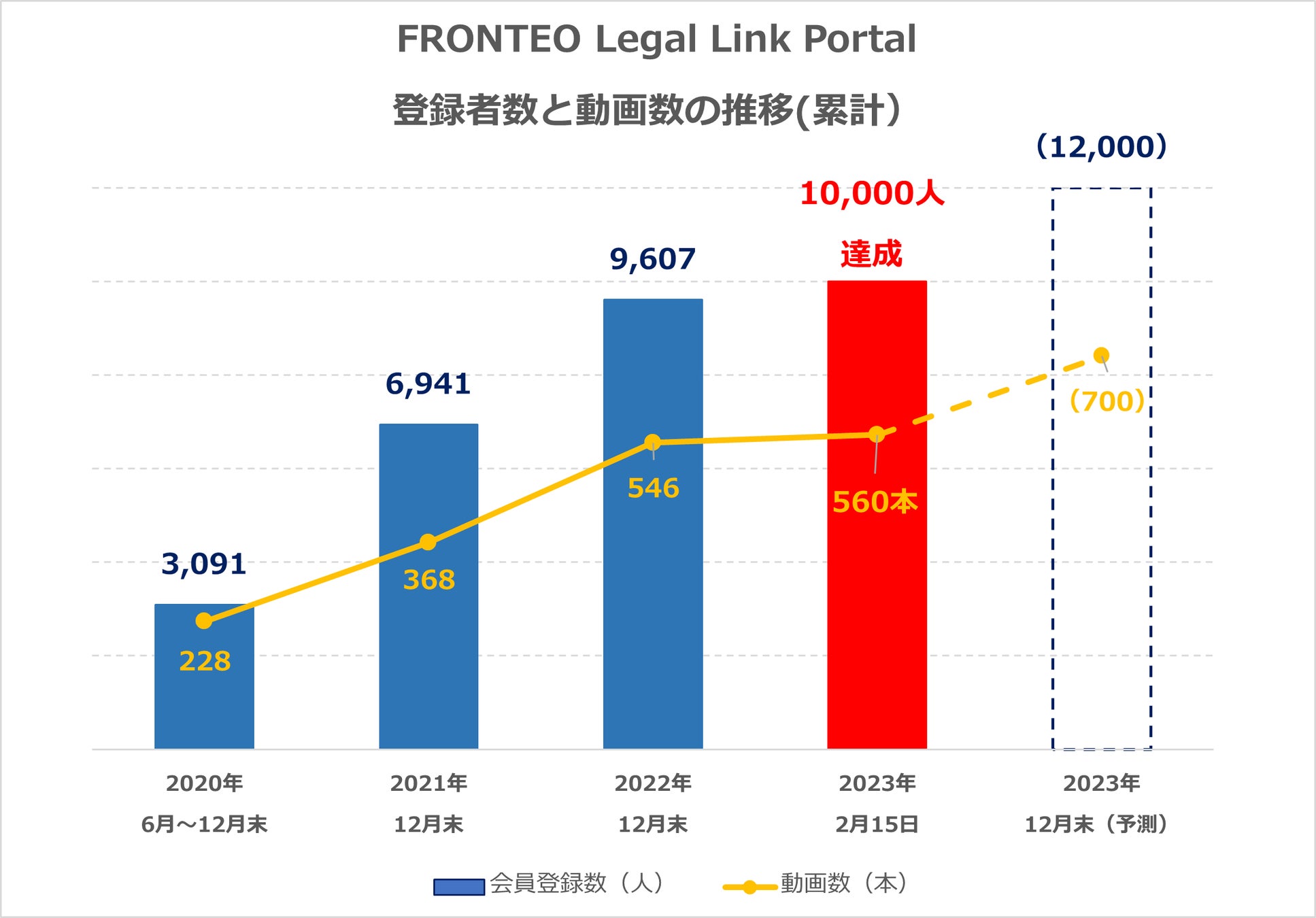 法務知財関連の担当者等にとって魅力的なウェビナーの配信を継続した結果、登録者数は2023年2月15日に1万人に達し、同日時点での登壇者は、日米の大手弁護士事務所を含む56社を中心に210人を超え、視聴可能な動画コンテンツ数は560本以上に上ります。現状の水準で推移すると2023年末には登録者数が約1万2000人に達する見込みです。