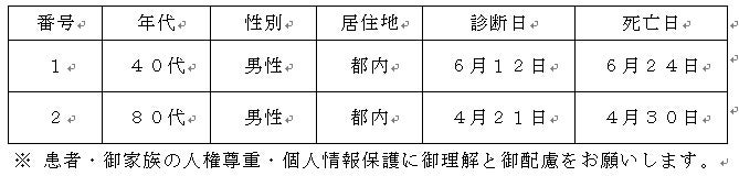 新型コロナウイルスに関連した患者の死亡について business Twitter Facebook はてブ Pocket LINE コピー 2022.06.28 この記事は約1分で読めます。 都内で新型コロナウイルスに感染した方が死亡されましたのでお知らせします。 お亡くなりになった方のご冥福をお祈り申し上げます。