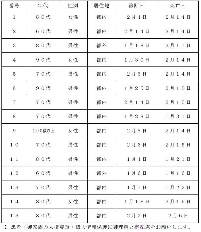 新型コロナウイルスに関連した患者の死亡について business Twitter Facebook はてブ Pocket LINE コピー 2023.02.16 この記事は約1分で読めます。 都内で新型コロナウイルスに感染した方が死亡されましたのでお知らせします。 お亡くなりになった方のご冥福をお祈り申し上げます。 1 新型コロナウイルスに関連した死亡者(本日公表分) 2 新型コロナウイルスに関連した死亡者の累計 7,867人