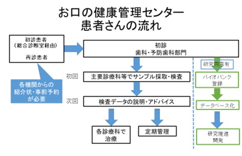 - 同センターの2つの柱は、歯科健診(歯科ドック)を通じた健康増進とバイオバンク登録による研究推進です。