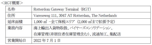 当社オランダ法人であるHANKYU HANSHIN EXPRESS (NETHERLANDS) B.V. は、欧州最大の貿易港を擁するロッテルダムに、新倉庫「Rotterdom Gateway Terminal」(ロッテルダム ゲートウェイ ターミナル、以下RGT)を開設し、7月1日より営業を開始します。