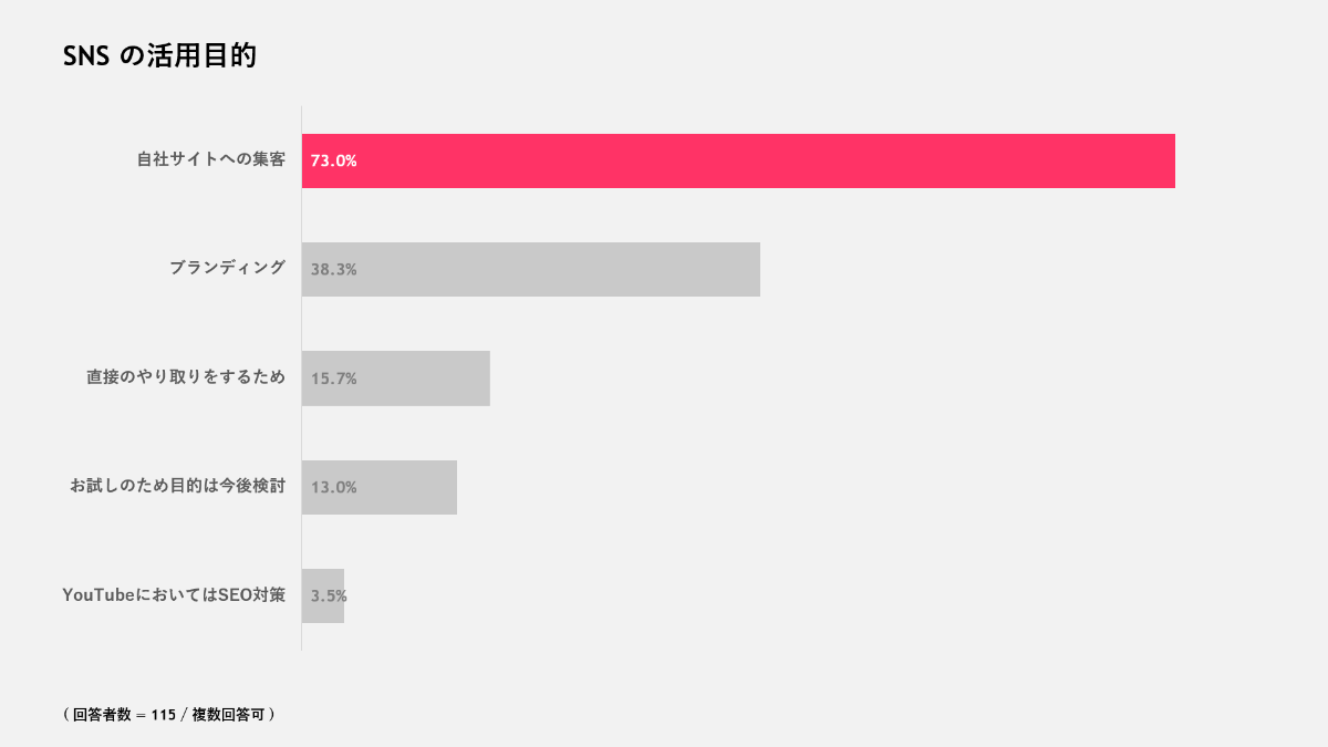 - SNSの活用目的は「自社サイトの集客」が最多で73.0%、「ブランディング」が38.3%